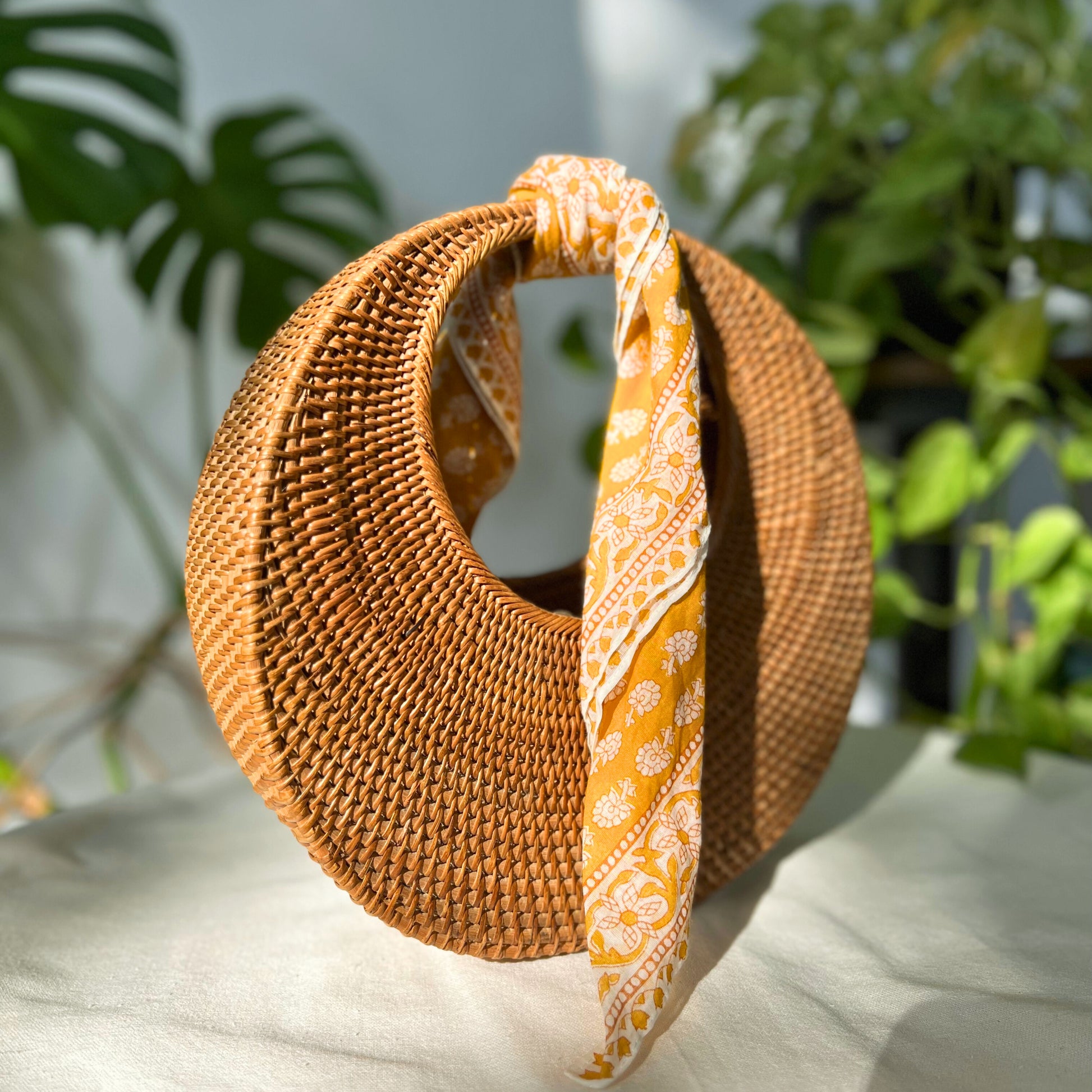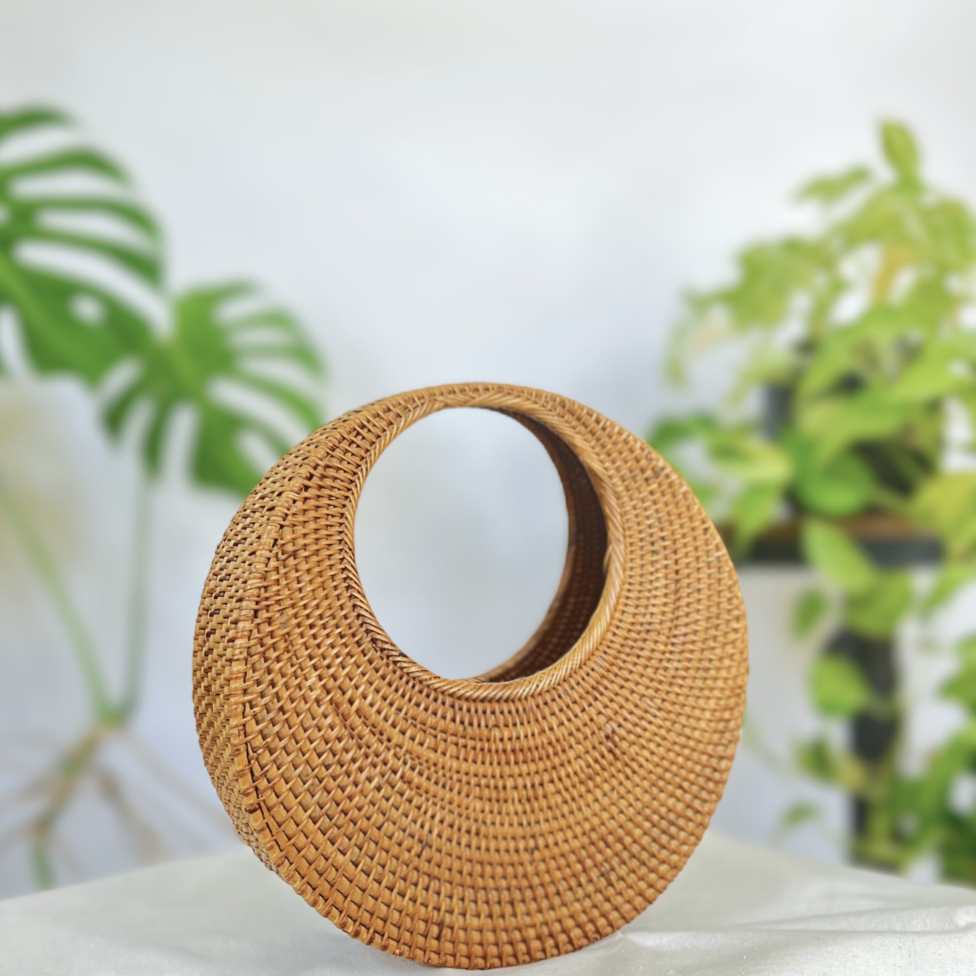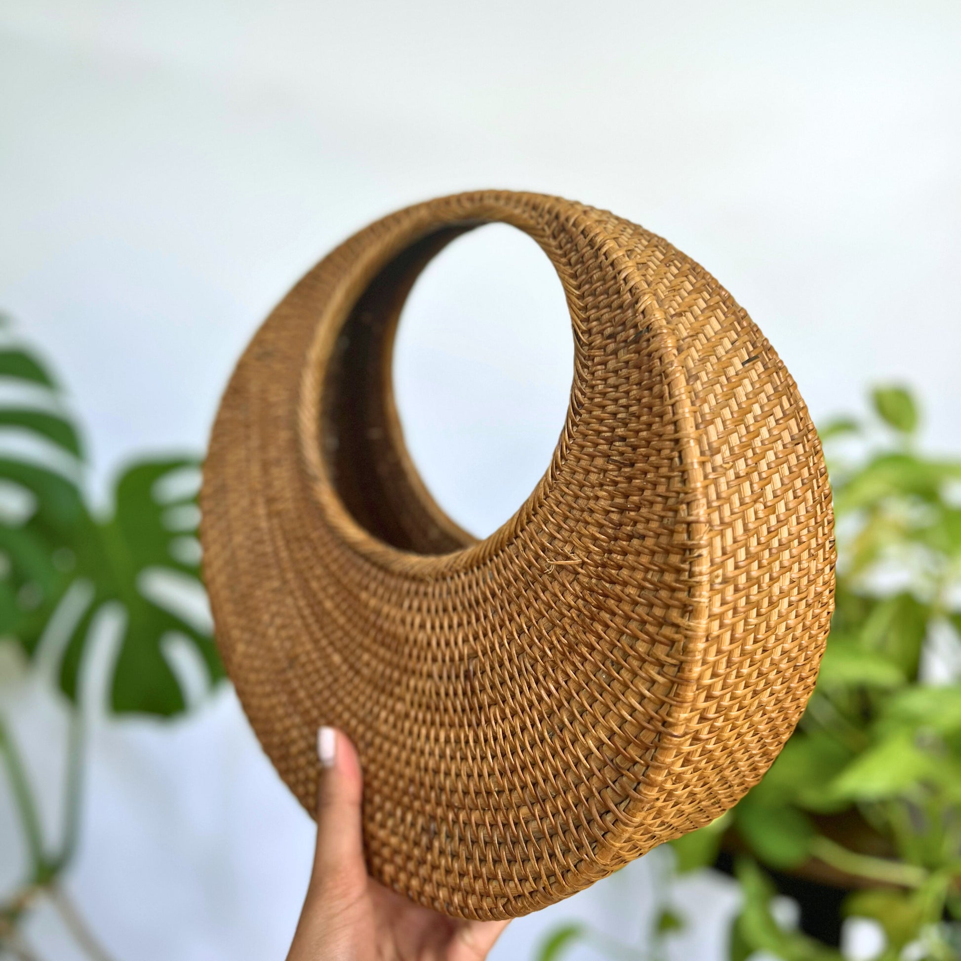 Introducing our crescent moon bag from our BALI collection, a unique addition to our handcrafted rattan bag collection with a simple yet eye-catching circular handle design, perfect for any summer outfit and beach day essentials.