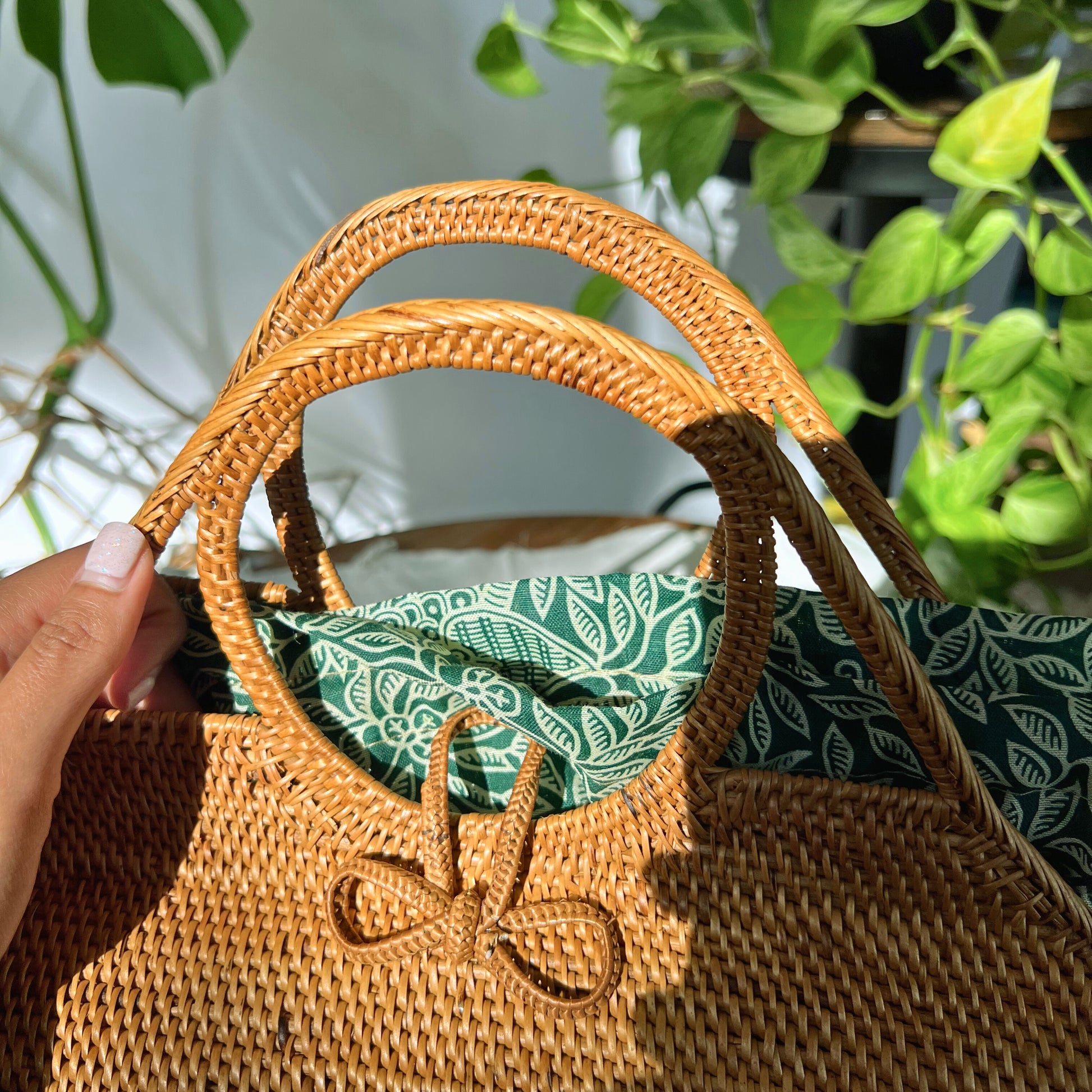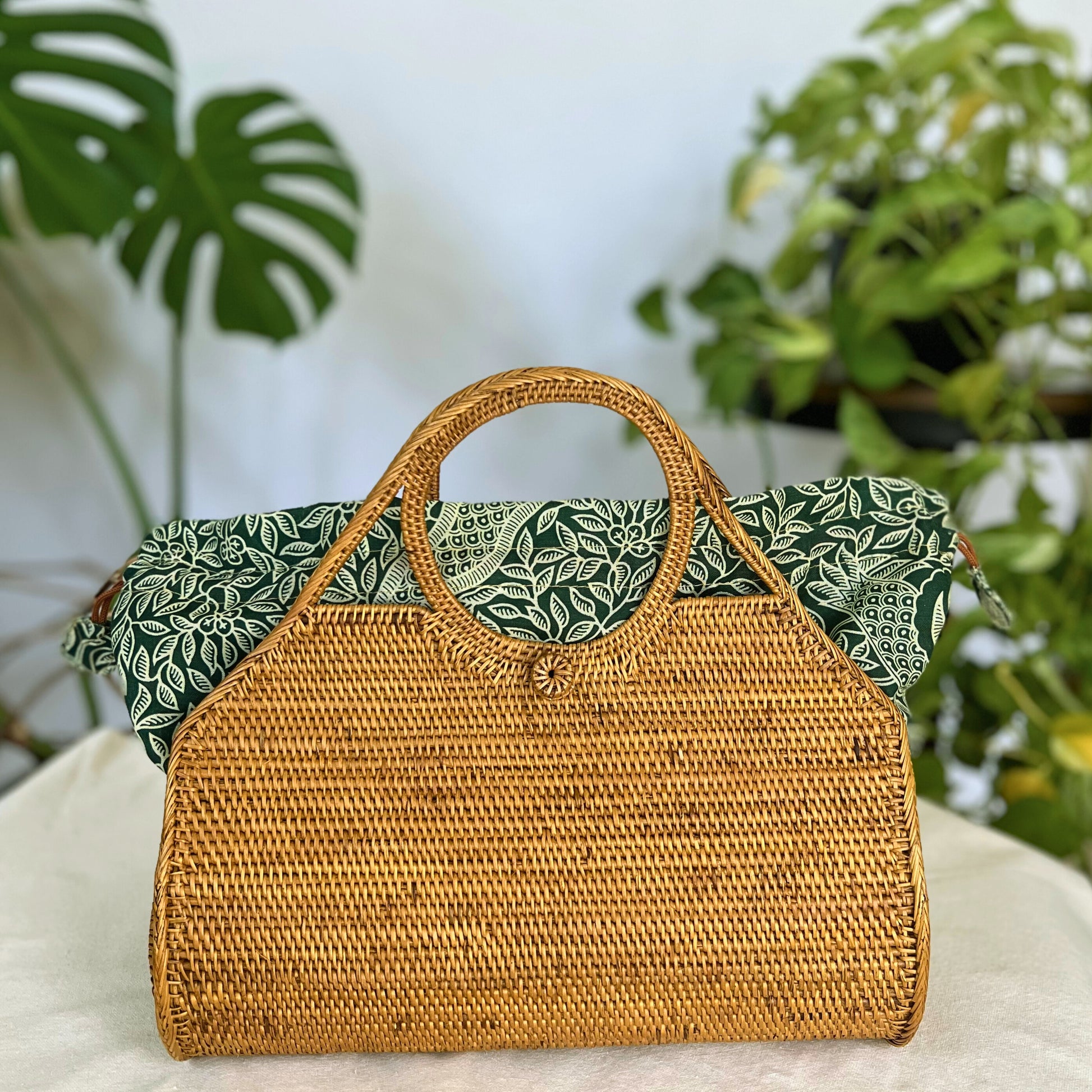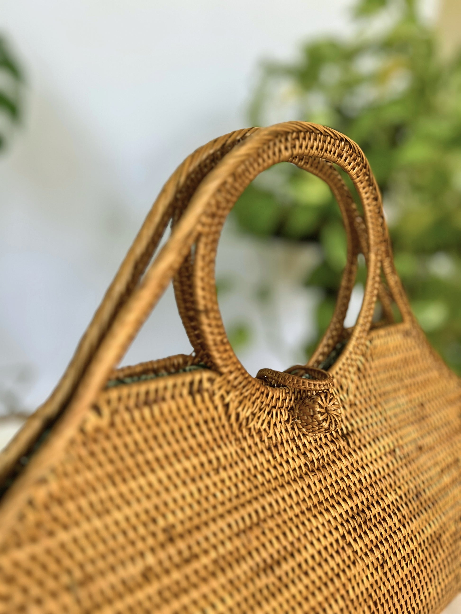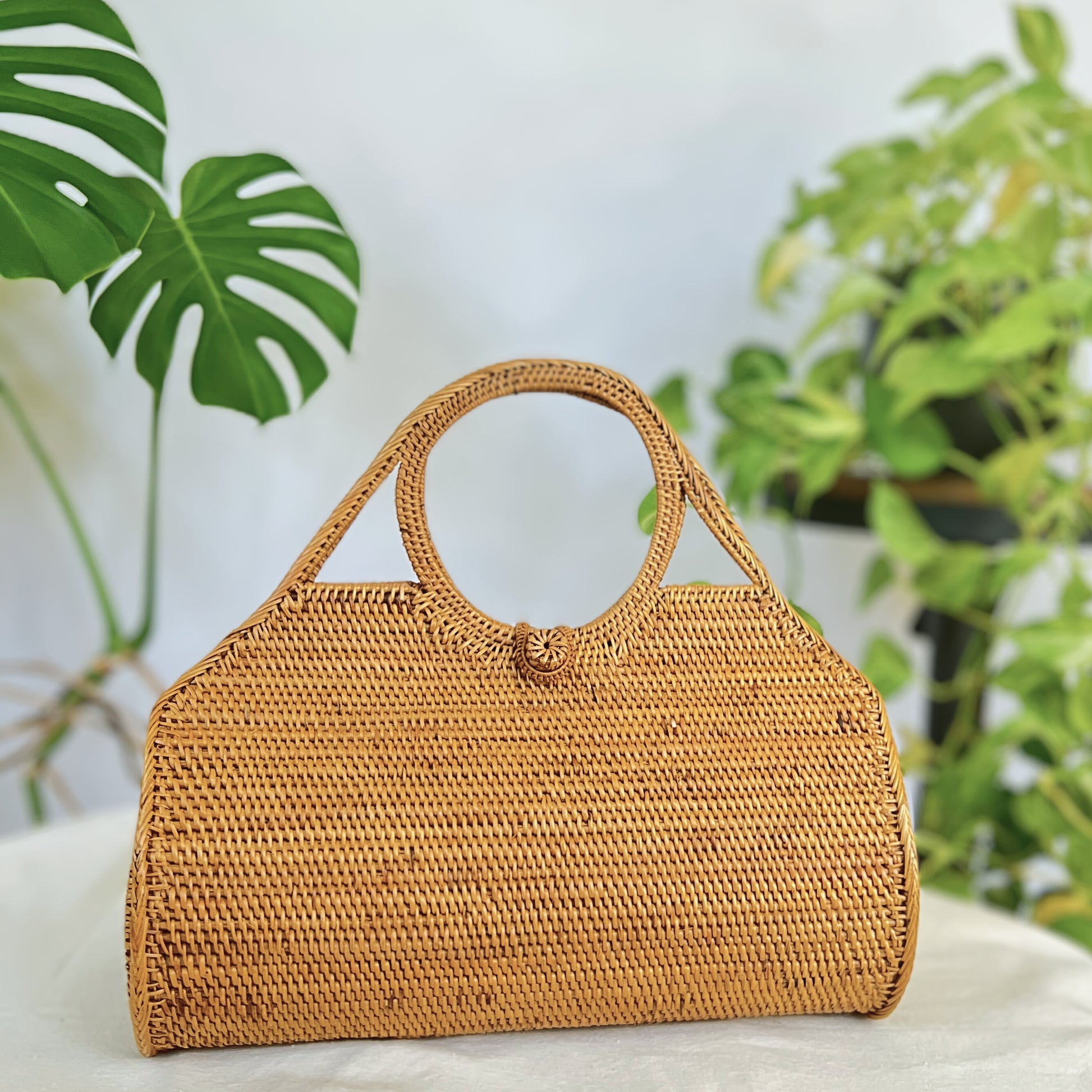 Introducing our oasis bag, a stunning top handle bag, handcrafted with the finest quality rattan material in a simple and elegant design. The tube shape adds a touch of uniqueness to this bag, making it the perfect statement piece for any summer outing. Its lightweight and spacious design make it an ideal choice for carrying your essentials while adding a touch of natural beauty to your wardrobe. Elevate your style with our one-of-a-kind top handle bag, perfect for lunch or dinner in the summer sun.